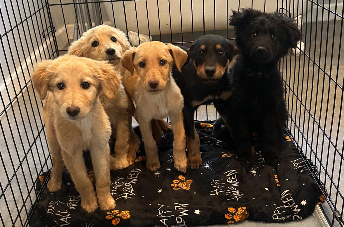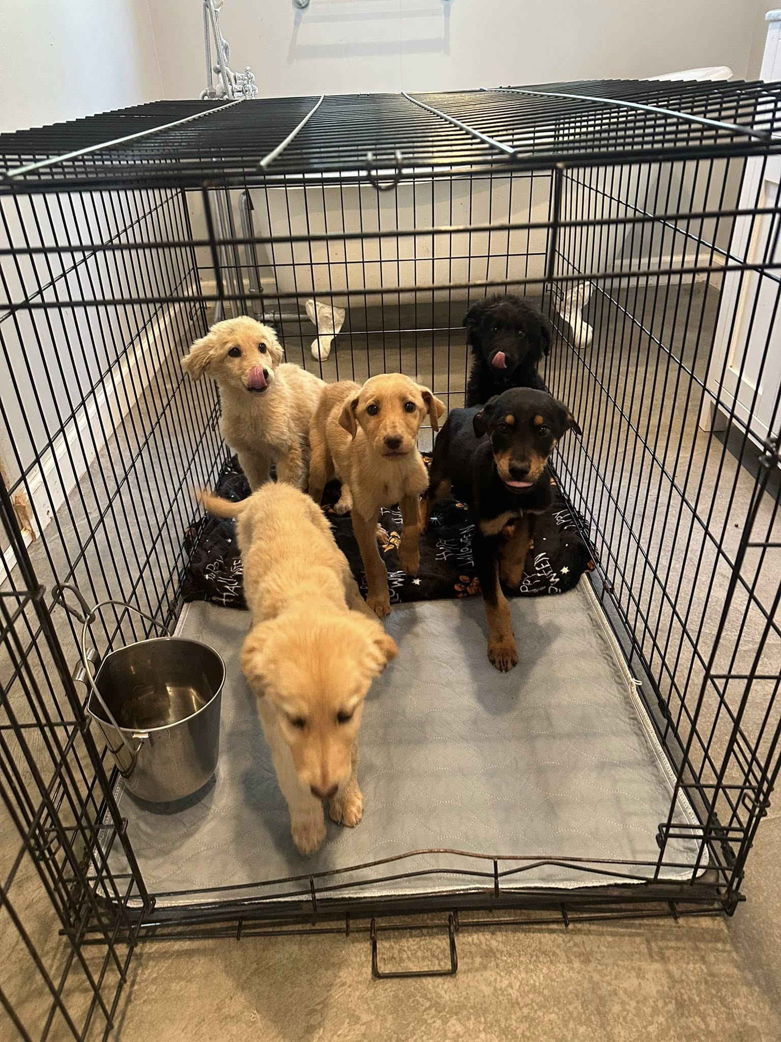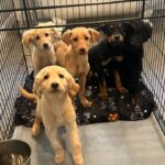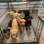 So…we rescued 10 week old Golden Retriever & Shepherd/Dobie mixed pups. 3 males (see first pic on the lineup below)